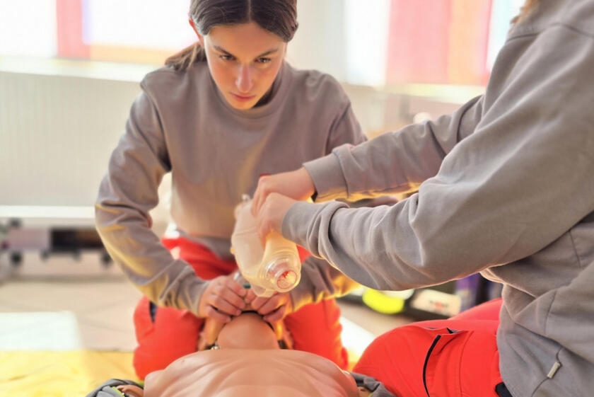 Spaß haben auch Emma und Eva, vor allem dann als sie endlich selbst Hand anlegen können. An einer Puppe üben sie einen Menschen zu reanimieren und zu beatmen. Schnell wird klar: Das ist keine leichte Aufgabe. Aber im Team klappt es bei den beiden ziemlich schnell ziemlich gut. „Das ist auch bei uns im Einsatzfall nicht anders. Wir müssen Hand in Hand arbeiten, viel miteinander reden und uns aufeinander verlassen können“, erklärt Franziska Gumbmann. Interesse und Engagement für den Job bringen Eva und Emma auf jeden Fall mit, das hat der Girls’Day gezeigt. Beide gehen aktuell in die 8. Klasse und haben damit noch ein bisschen Zeit, bis sie eine Entscheidung für ihre berufliche Zukunft treffen müssen. Eine Karriere im Rettungsdienst ist nach diesem Tag aber vielleicht ein bisschen näher gerückt.