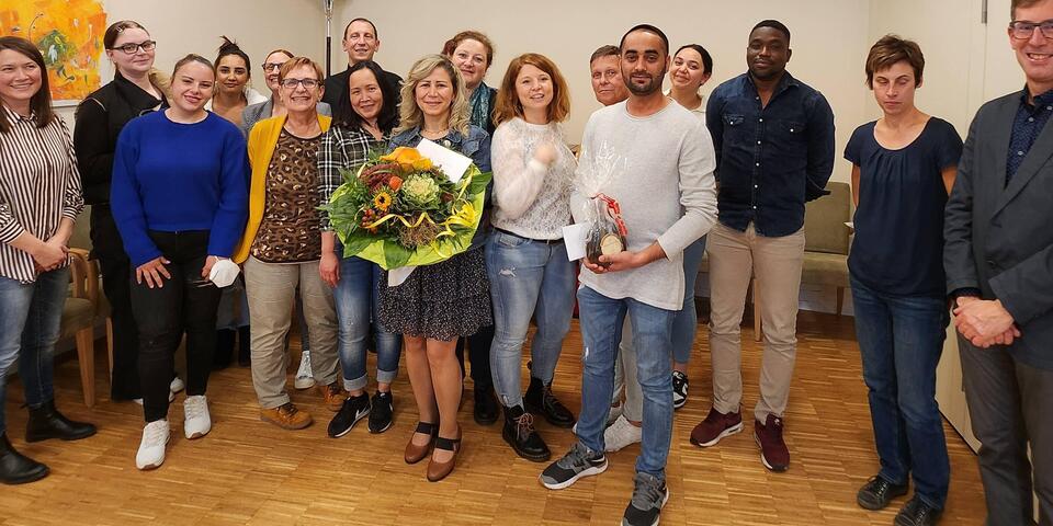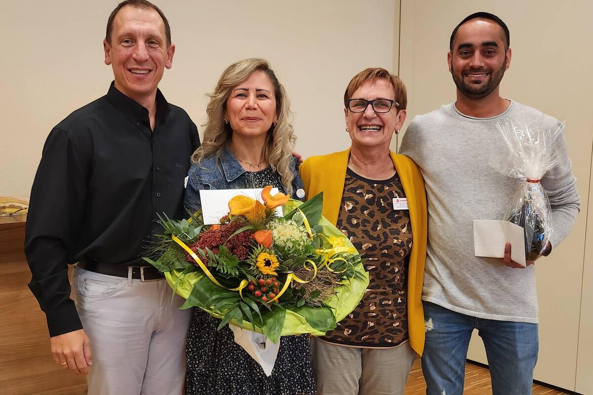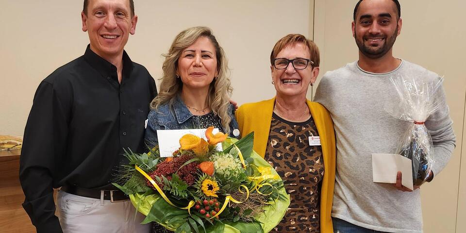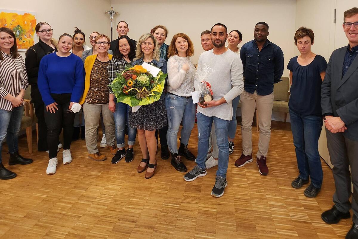 „Deshalb gehen Ramia Alshahoud als letzte Altenpflegerin und Harjit Singh als letzter Altenpfleger in die Annalen des Johanniter-Hauses ein“ verkündete Pflegedienstleiterin Ute Leder mit einem Augenzwinkern. Gemeinsam mit Einrichtungsleiter Kai Schramm gratulierte sie Alshahoud und Singh zur bestandenen Prüfung mit einem Blumenstrauß bzw. einer Flasche Wein und einem Präsent. „Was die beiden geleistet haben ist gar nicht hoch genug zu bewerten, wenn man berücksichtigt, dass sie kaum ein Wort deutsch sprechen konnten als sie zu uns kamen“ betonte Schramm in seiner Laudatio und bedankte sich in diesem Zusammenhang bei allen beteiligten Praxisanleitern und Kollegen ohne deren Unterstützung dieser „historische Erfolg“ nicht möglich gewesen wäre.