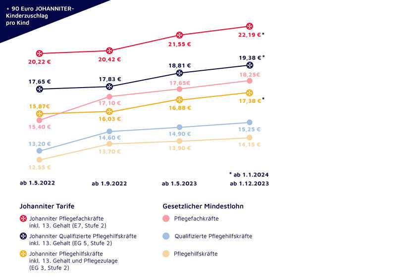 Und auch für die Zukunft sind die Weichen auf Gehaltszuwachs gestellt. Die nächsten Angleichungen stehen für den 1. Januar 2023 und 1. Januar 2024 an. Das Johanniter-Gehalt liegt damit – am Stichtag der nächsten Erhöhung des gesetzlichen Mindestlohns am 1. Mai 2023 – weiterhin deutlich über den gesetzlichen Anforderungen: Die Entlohnung der Fachkräfte liegt pro Stunde 3,90 über dem Mindestlohn, bei qualifizierten Hilfskräften sind es 3,91 Euro und für Hilfskräfte 2,98 Euro.