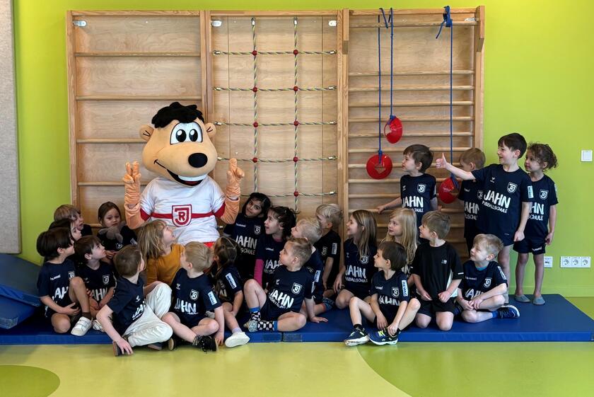 Angeleitet von SSV Jahn-Trainer Noah Fuchs absolvierten die Kinder jeden Dienstag abwechslungsreiche Übungseinheiten in der Turnhalle der Einrichtung. In einer spielerischen und kindgerechten Atmosphäre erlernten die Kinder grundlegende motorische Fertigkeiten in unterschiedlichen Bewegungslandschaften. Zum feierlichen Abschluss besuchte sogar das beliebte Maskottchen „Jahni“ die jungen Sportlerinnen und Sportler.