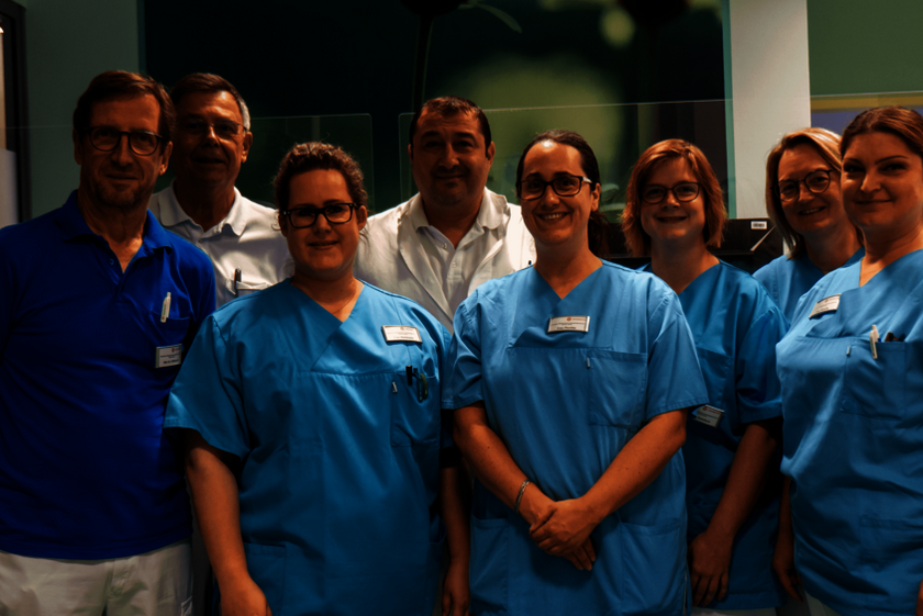 Auf der gleichen Etage befinden sich neben dem ambulanten OP auch der Trakt mit dem Haupt-OP und der Intensivstation des Johanniter-Krankenhauses. Das ermögliche eine gute interdisziplinäre Zusammenarbeit mit den verschiedenen Fachabteilungen, so Herr Dr. Hillebrand. Zudem sei die räumliche Nähe zum Krankenhaus sehr wichtig. Diagnose, Behandlung und Nachbehandlung können in einem Haus erfolgen. „Das ist gut für die Patienten“, so Herr Dr. Hillebrand, „es sind kurze Wege, bekannte Gesichter bei der Behandlung und Versorgung und für die beteiligten Mitarbeitenden ist ein schneller Austausch gewährleistet“.