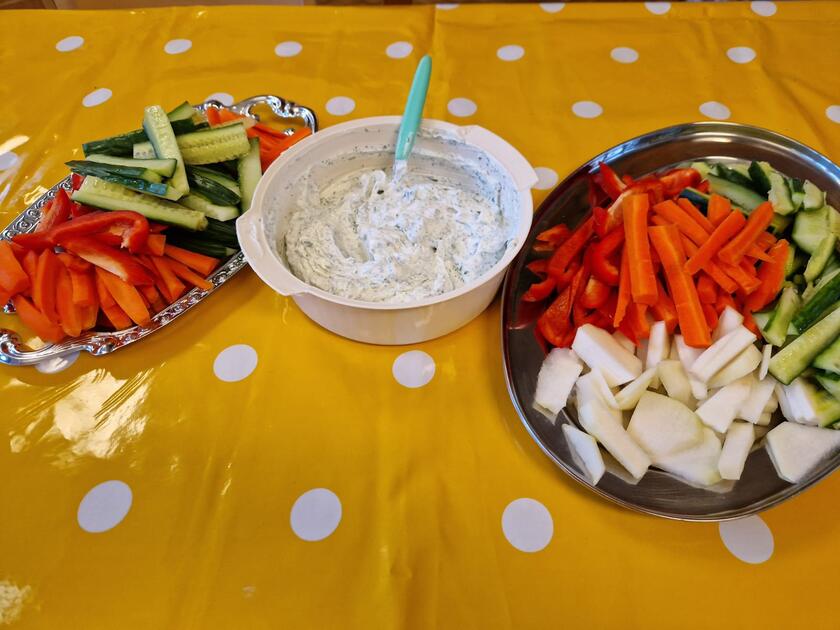 Zum Abschluss der Ernährungswoche trafen sich alle Gruppen im Mehrzweckraum. Hier wurde sich über das Gelernte ausgetauscht und zubereitete Sachen probiert.