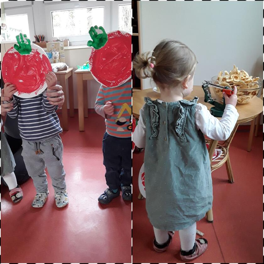 Die Schäfchen hatten den Apfel als Thema. Sie haben ihre gebastelten Äpfel gezeigt, das Lied "In einem kleinen Apfel" vorgesungen und ihre Apfelchips zum Probieren angeboten.