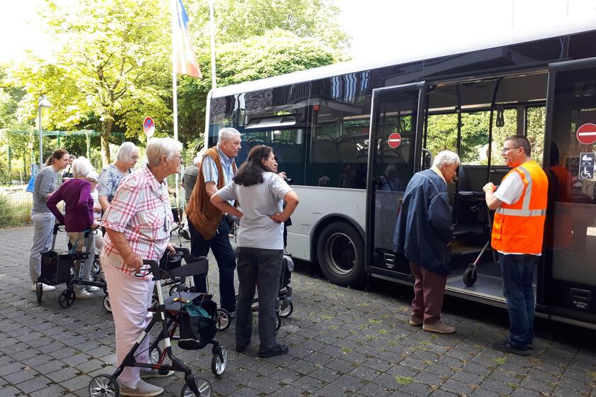Rheinbahn-Mitarbeiter Thomas Thiel leitete die Seniorinnen und Senioren an und erklärte, wie sie den Rollator kippen müssen, um ihn in den Bus zu bekommen. „Ganz wichtig: Wenn der Rollator im Bus ist und Sie zusteigen, halten Sie sich nicht am Rollator, sondern an den Türgriffen fest“, so der Hinweis des Fachmanns. Unter seinen Augen steigt Helga ein und wieder aus und stellt anschließend fest: „So fühle ich mich schon viel sicherer.“