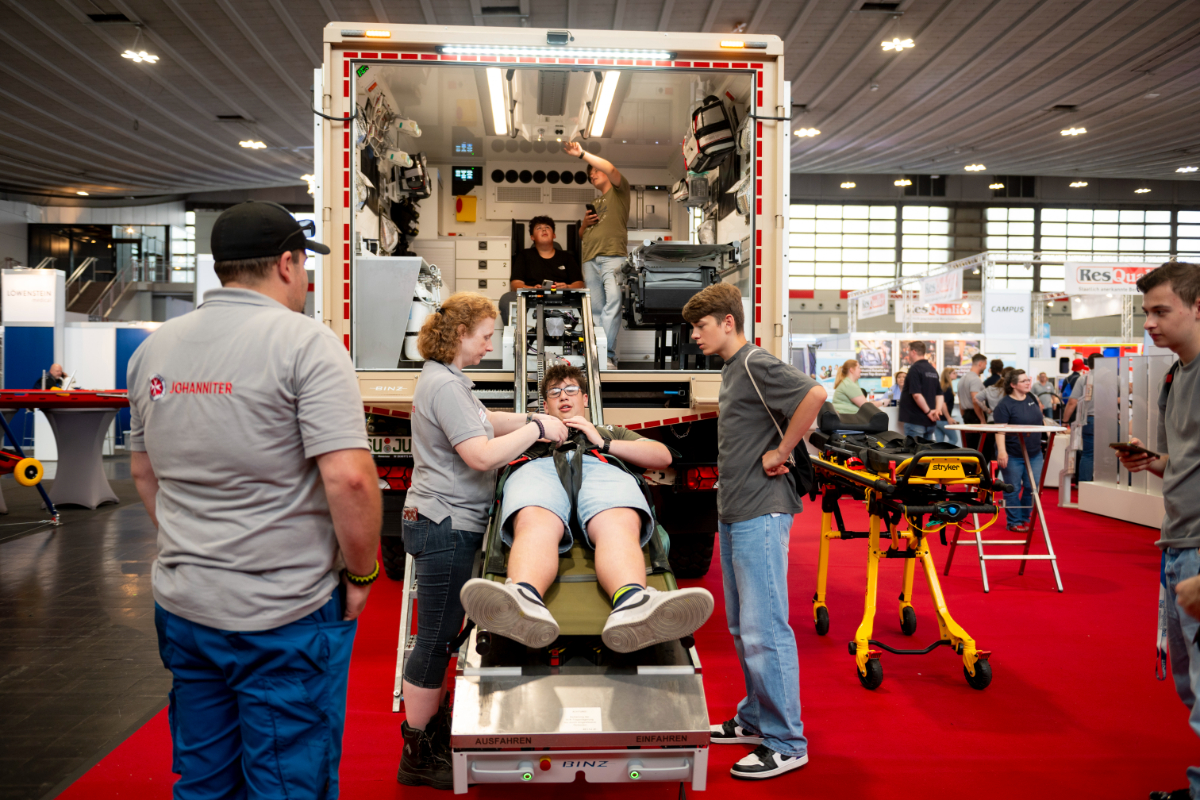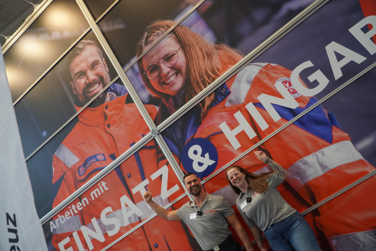 Ein zentrales Thema war die Vorstellung der Johanniter-Unfall-Hilfe als Arbeitgeberin im Rettungsdienst. Neben Gesprächen über Einstiegsmöglichkeiten für Fach- und Nachwuchskräfte fanden moderne Einsatzfahrzeuge wie ein Unimog-Krankenkraftwagen große Aufmerksamkeit. Die Johanniter zeigten sich als moderner, offener und verlässlicher Partner für Menschen, die sich engagieren möchten – beruflich oder ehrenamtlich. Die Johanniter Jasmin und Jannis waren doppelt da: einmal riesengroß auf der Messewand am Innenstand und einmal “in echt” und echt sympathisch.