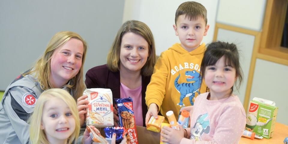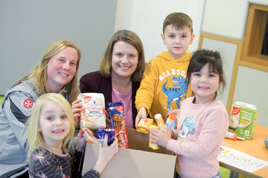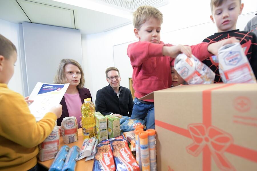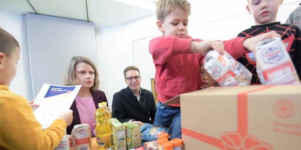 Gemeinsam mit Kindern der MHH-Betriebskita „Weltkinder“ und ehrenamtlichen Einsatzkräften packte die Kultusministerin Pakete für den diesjährigen Spendentransport