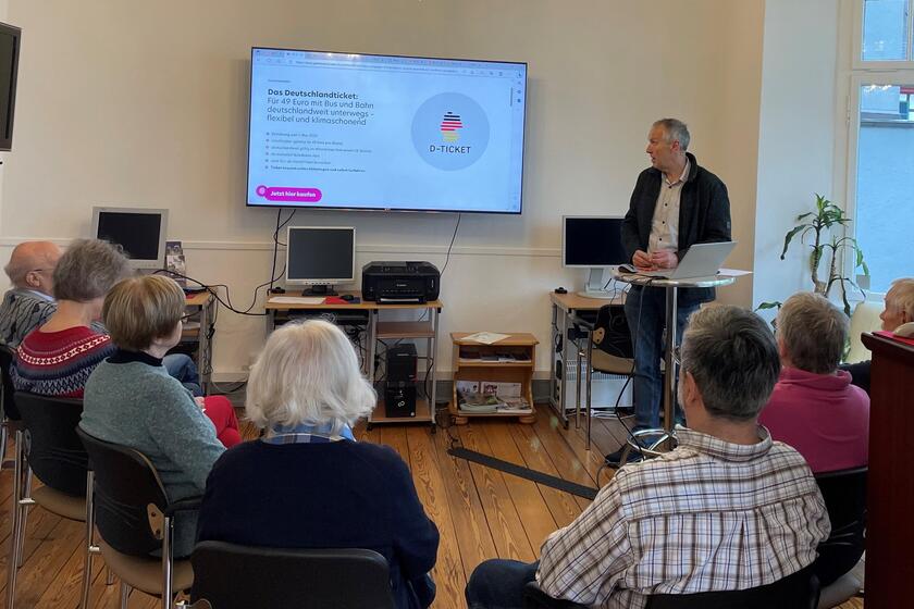 Das brandaktuelle Thema „49-Euro-Ticket“ wurde an einem weiteren Vormittag erläutert. Jens Knoth informierte über alle wichtigen Eckdaten zu diesem Deutsche-Bahn-Ticket. Wo bekomme ich das Ticket zu kaufen? Was ist bei einer Kündigung zu beachten? Wohin kann ich mit dem Ticket fahren? Diese und andere Fragen wurden ausgiebig erläutert und verschaffte der Zuhörerschaft einen guten Überblick zu dem Thema.