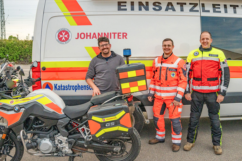 Bildnachweis: Michael Raab, Johanniter Oberbayern Bildunterschrift: Durch das Ehrenamt freundschaftlich verbunden: Andreas Lechner, Benedikt Eibel, Martin Stäbler (v. l.) von der Motorradstaffel der Johanniter Oberbayern.