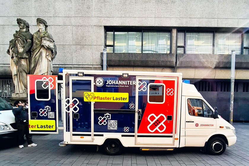 Unser Pflasterlaster ist ein ehemaliger Rettungswagen, der gut erkennbar und beschriftet ist. Er ist mobiler Behandlungsraum und ausgestattet mit Materialien zur (Wund-)Versorgung und Diagnostik. Das Angebot ist kostenfrei und für jede und jeden zugänglich. Im Zeichen unseres Leitspruchs „Aus Liebe zum Leben“ ist jeder Mensch willkommen, auch ohne Krankenversicherung.